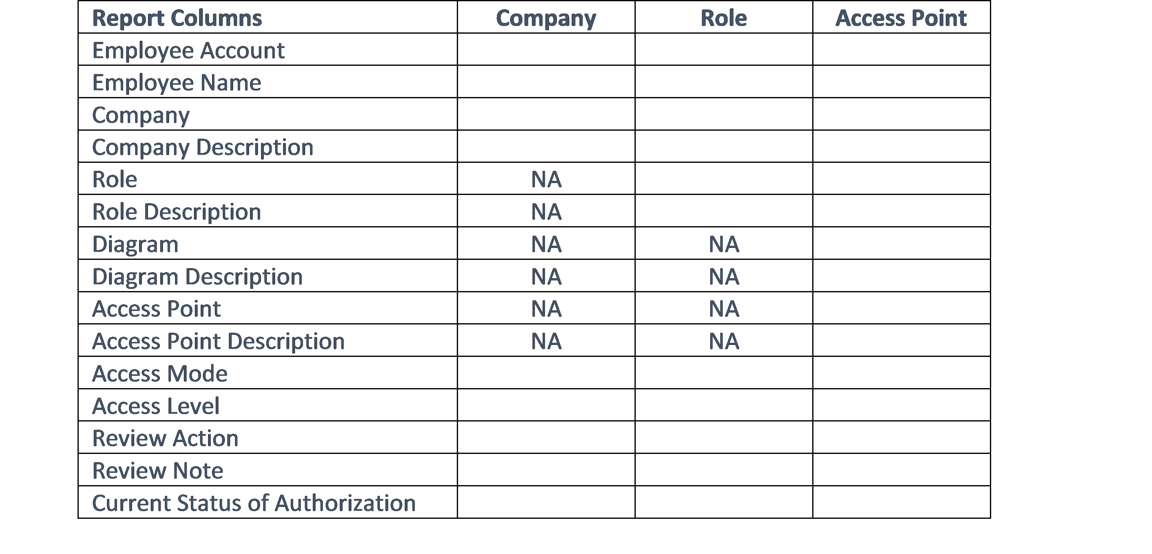 The report shows the following columns. In case of Review Level “Company” and “Role” some columns will not show (as indicated in then table by NA.