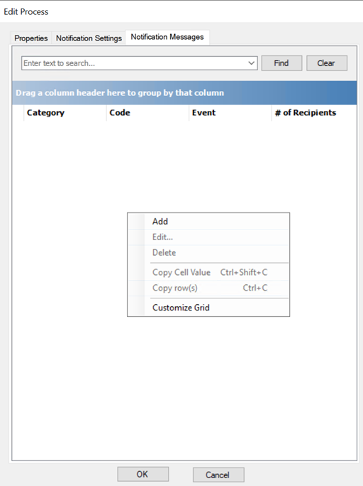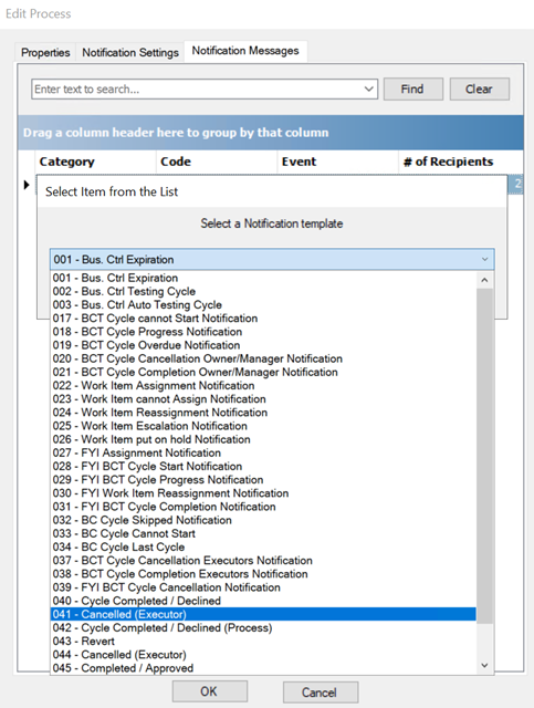This will bring the list of standard messages. A message can be selected and be associated to the Process.
