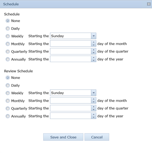 Schedule- This button will bring a pop up dialog in which the Testin and Review Schedule can be edited or defined. Default this will show the Testing and Review schedule as configure don the Master Control.
