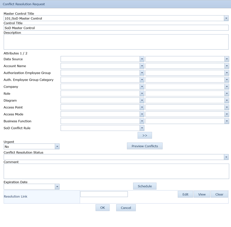 An SoD Mitigation Request can also be initiated from this menu option, without selecting any conflicts. Similar as if conflicts are selected, first a Master Control (Template) is to be selected, after which the entry form is populated based on the configuration of the Request Process as is configured on the Master Control.