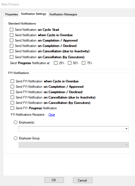 In the notification settings it is indicated at which Process event a message is to be send. The message recipients are defined in the message itself. (see Administration / Notifications). The Completion notification can now we Completed / Approved of Completed / Declined.