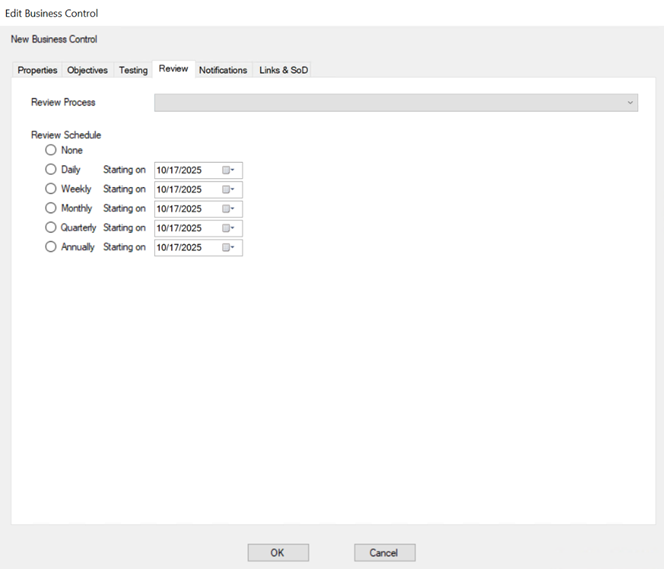 The Control tab “Review is added. In the Review Tab, similar as the Testing Tab, the Review Process for this Control and the Review Schedule can be defined. The purpose of the Review process is to validate that the Control is still effective.